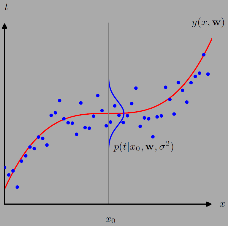사인 곡선 회귀를 예시로 기계학습의 몇가지 통찰을 베이지안 접근을 통하여 얻어보자. 훈련 데이터 셋을 \(\mathcal{D}\) 라고 하자. 선형 회귀 문제에서 파라미터가 최대 우도법을 사용하여 선택될 수 있다는 것을 이미 알아보았다. 즉, 최대 우도법에서 우도 함수 \(p(\mathcal{D}|\mathbf{w})\) 를 최대화하는 값의 집합 \(\mathbf{w}\) 로 파라미터가 선택된다. 기계학습에서 음의 로그 우도 함수를 에러 함수라고 한다. 음의 로그는 단조 감소 함수이므로 우도의 최대화는 에러의 최소화와 같기 때문이다. 에러의 최소화를 통하여 파라미터 값을 특정할 수 있는데, 이를 \(\mathbf{w}_{\text{ML}}\) 라고 표기한다. 이 파라미터로 새로운 데이터에 대한 예측을 수행하게 된다.