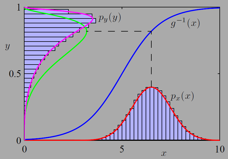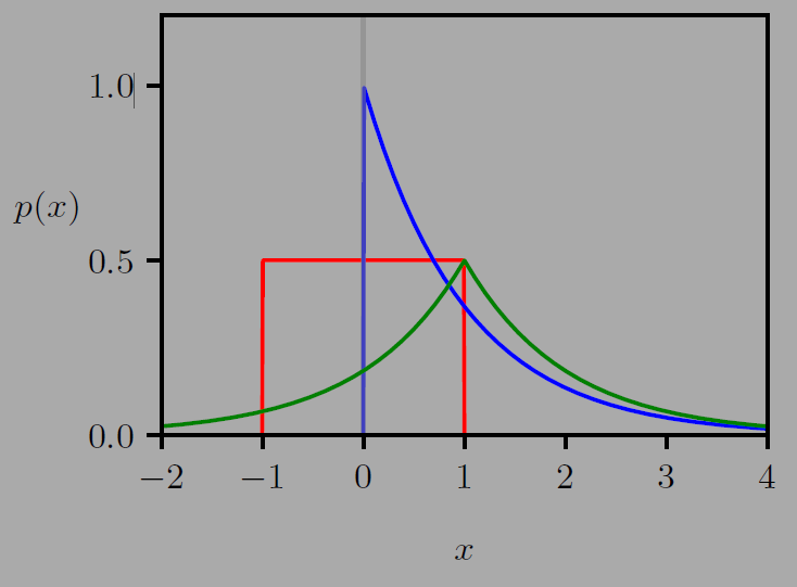 \(x\) 가 구간 \((x, x+\delta x)\) 에 속할 확률이 \(\delta x \to 0\) 로 갈 때 \(p(x) \delta x\) 가 되도록 연속 변수 \(x\) 에 대한 확률 밀도 \(p(x)\) 를 정의한다. \(x\) 가 구간 \((a,b)\) 에 속할 확률은 다음과 같이 주어진다.