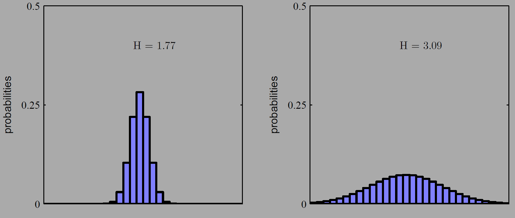 • 따라서 가우스 분포가 넓어질수록, 즉, 분산 \(\sigma ^{2}\) 가 증가할수록 엔트로피가 올라간다. 이 결과는 \(\sigma ^{2} < 1 / (2 \pi e)\) 에 대하여 \((2.99)\) 에서 \(\mathrm{H}(x) < 0\) 이므로 이산 엔트로피와는 달리 미분 엔트로피가 음이 될 수 있다는 것을 의미한다.