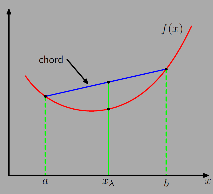 볼록 함수는 모든 현(chord)이 함수 위에 있는 함수이다. 이러한 함수 \(f\) 의 볼록성(convexity)을 다음과 같이 정의할 수 있다.