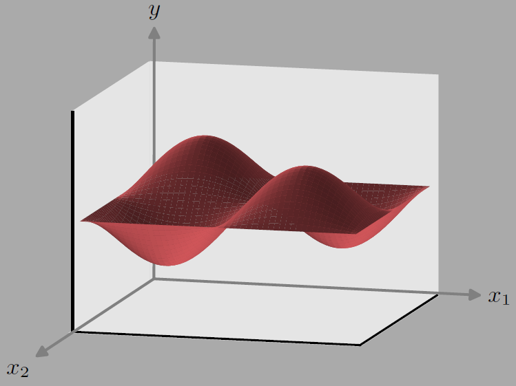 함수 \(y(x_1, x_2) = \sin (2 \pi x_1) \sin (2 \pi x_2)\) 와 같이 데이터가 생성되는 존재를 관찰한다고 하자. 이 함수에 가우스 노이즈를 포함시켜서 그래프를 그리면 다음과 같다.