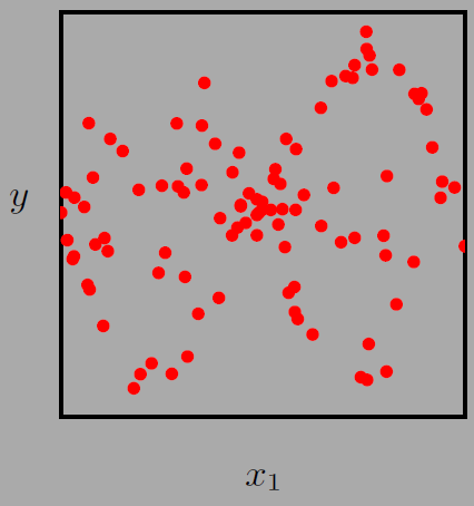 이 그래프의 \(x_2\) 를 관찰하지 못한채 \(x_1\)\(y\) 만을 부분적으로 관찰하여 \(100\)개의 데이터 포인트를 확보한 것은 다음과 같다. 이 존재를 부분적으로 관찰하는데에서 나오는 노이즈로 인하여 이 존재의 본질을 제대로 이해할 수 없다.