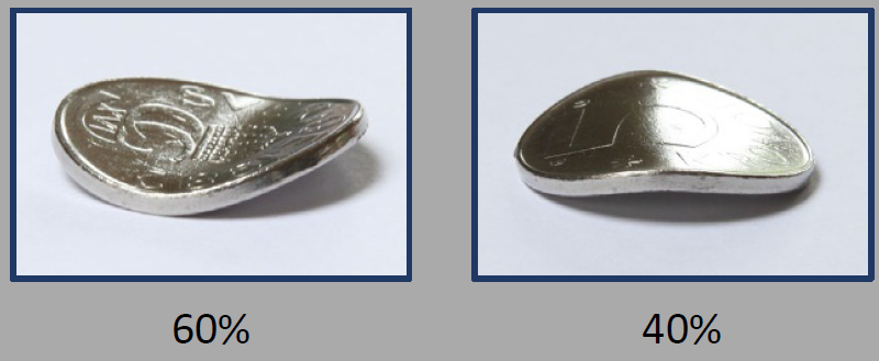 다음과 같이 한쪽으로 약간 접힌 동전을 던졌을 때 앞면이 60% 확률로 나오고 뒷면이 40% 확률로 나온다.