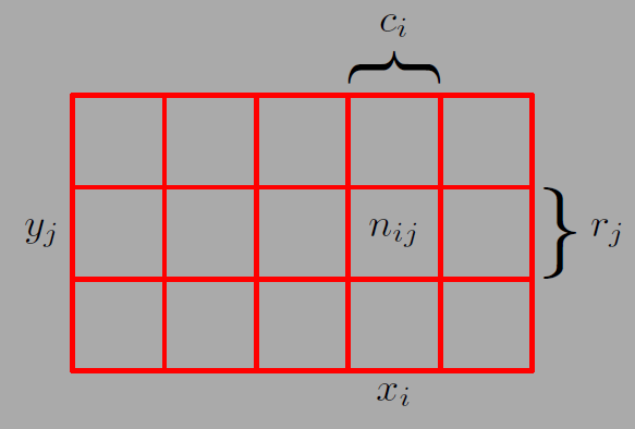 \(X\)\(i=1,\dots ,L\) 에 대한 값 \(x_i\) 중 하나를 가질 수 있고, \(Y\)\(j=1,\dots ,M\) 에 대한 값 \(y_j\) 중 하나를 가질 수 있다. \(X\)\(Y\) 가 취할 수 있는 모든 값을 \(N\) 이라고 하고, \(X=x_i\)\(Y=y_j\) 일 때의 시행의 수를 \(n _{ij}\) 라고 하자. 또한, \(X\) 가 취한 값 \(x_i\) 의 수를 \(c_i\) 라고 하고, \(Y\) 가 취한 값 \(y_j\) 의 수를 \(r_j\) 라고 하자.