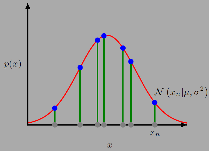 \(p(\mathcal{D}|\mathbf{w})\) 를 파라미터 벡터 \(\mathbf{w}\) 의 함수로 볼 때 이것은 우도 함수가 되고, 이것으로 관찰된 데이터 셋이 각기 다른 \(\mathbf{w}\) 의 값에 대하여 얼마나 가능성이 있는지 표현할 수 있다. 이때, 우도 함수 \(p(\mathcal{D}|\mathbf{w})\)\(\mathbf{w}\) 에 대한 확률분포가 아니고, 이것의 \(\mathbf{w}\) 에 대한 적분은 \(1\) 일 필요는 없다.