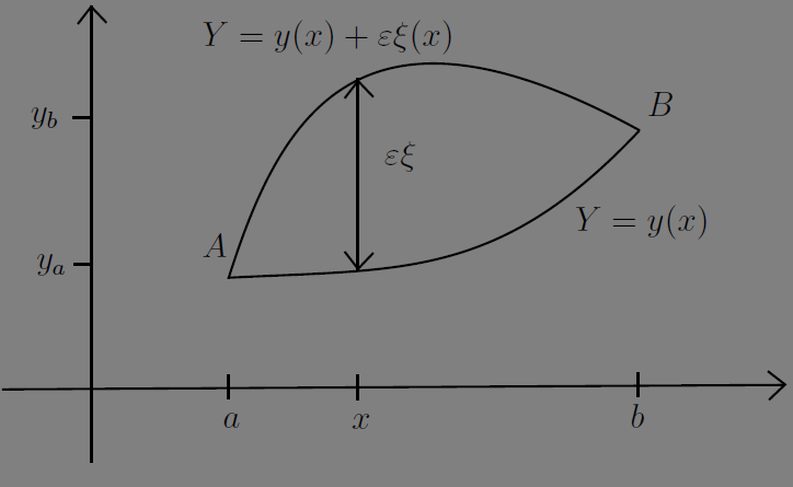 \[ \dfrac{\partial F}{\partial y} = \left\{ \dfrac{\partial F(x, Y, Y')}{\partial Y} \right\}_{Y=y,Y'=y'} \tag{3.17} \]\(\delta J \neq 0\) 라고 하면 \(J(Y) - J(y) = \delta J + \operatorname{O}_2\) 이다. 충분히 작은 \(\epsilon \xi\) 에 대하여 다음이 성립한다.