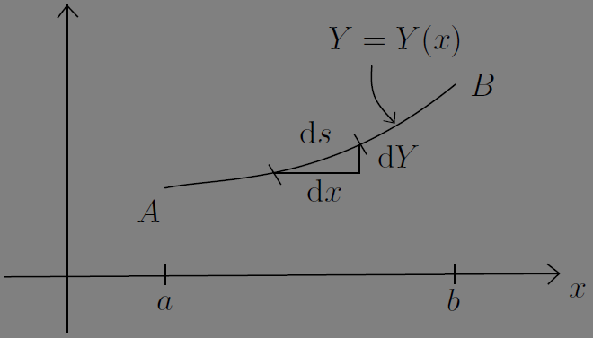 \[ \begin{equation}\begin{split} ds ^{2} & = dx ^{2} + dY ^{2} \\ & = \left\{ 1 + (Y')^{2}\right\} dx ^{2}\\ \end{split}\end{equation} \tag*{} \]\(A, B\) 사이의 경로를 찾기 위하여 \(A, B\) 사이의 \(ds\) 에 대한 적분 \(\int_{A}^{B}ds\) 을 취하자. 이 \(ds\) 를 위 식으로 치환하면 곡선의 길이를 표현하는 다음과 같은 식을 얻는다.