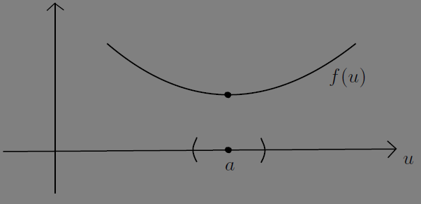 다음 그림과 같이 함수 \(f(u)\) 에 대하여 점 \(a\) 근방의 모든 \(u\) 에서 \(f(u) \geq f(a)\) 이면 \(u = a\) 를 극소점이라고 한다.(이는 극소점에서 일반적으로 정의했었다.)