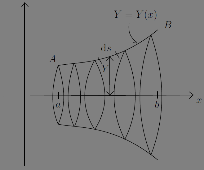 위와 같은 표면을 구하기 위해서는 점 \(A\) 와 \(B\) 사이의 \(2 \pi Yds\) 를 적분하면 된다. 즉, \(\int_{A}^{B}2 \pi Yds\) 를 구하면 된다. 위와 같이 \(ds\) 를 치환하면 다음을 얻는다.